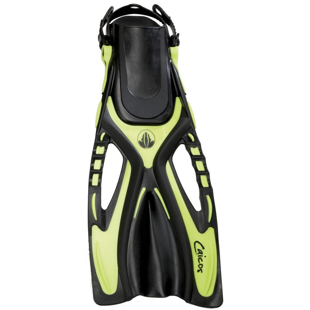The new Caicos fin has an extended sole plate, which adds thrust and relieves strain on your foot. Simple and reliable strap adjustment system. Contoured foot pocket for maximum comfort. Fins can be used with or without neoprene socks. High grade polypropylene material. The directional channel, in the middle of the fin, increases propulsion efficiency. Vent spaces, on each side of the fin, releases water not involved with thrust.