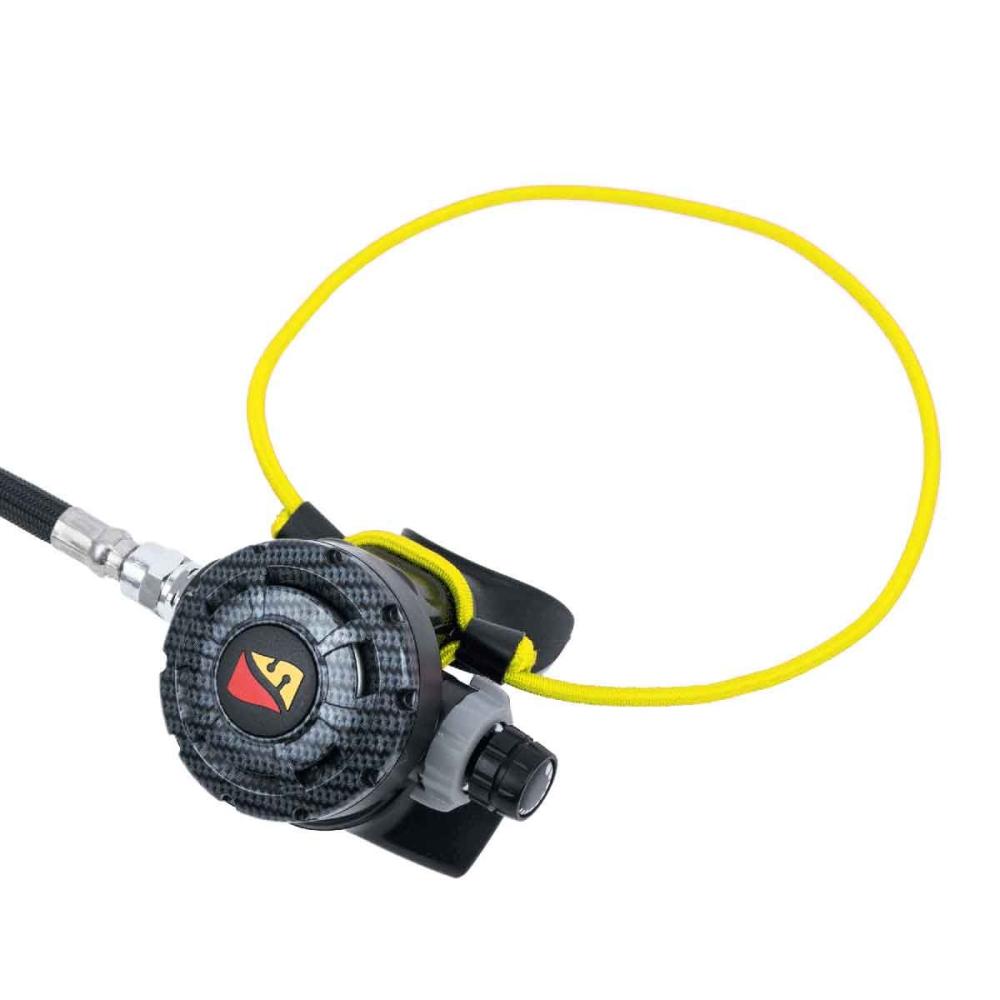 The Dive Rite Regulator necklace allows for easy size adjustment for a perfect fit. Simply tie an overhand knot at the desired length and trim the excess bungee. The knot recesses into the locking cone for a clean look. The necklace quickly installs onto the second stage by pulling both sides of the bungee to tighten the loop around the mouthpiece.