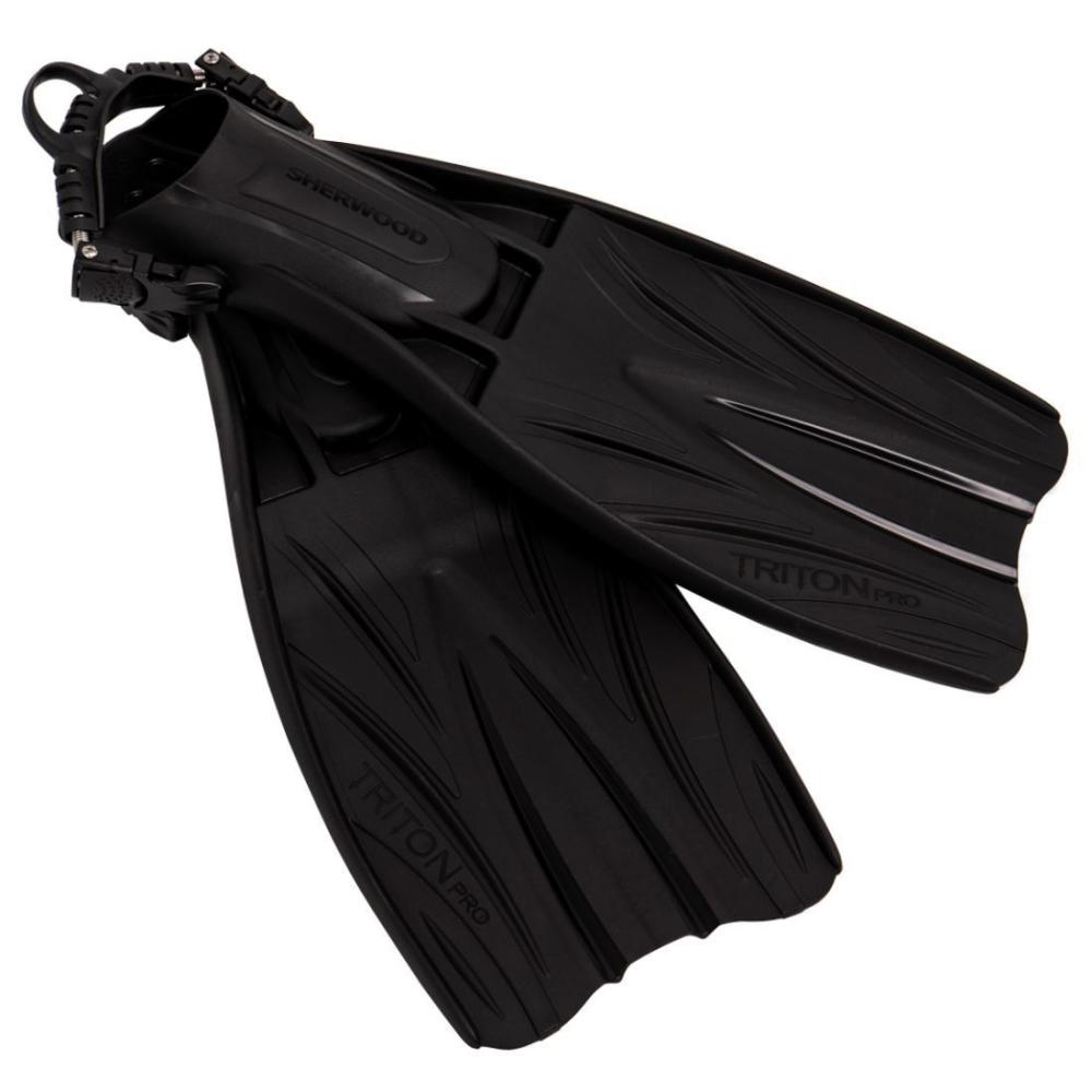 he Triton combines elements of classic vented fins with an updated design and modern materials. The result is a full-size fin that’s lightweight and flexible — but with a brisk snap that gives impressive power and acceleration. The large vents direct thrust for efficient kicking in any swim style, while the wide blade offers easy maneuverability. The long base of the foot pocket provides stability and comfort. Can upgrade to the Sherwood Stainless Steel Spring Straps. FEATURES Three vents between the foot pocket and blade provide additional thrust on the down kick and decrease drag on the up kick or recovery. Foot pocket shape and size derived from years of research to satisfy the most exacting requirements for comfort and power. Fin is positively buoyant and floats. Available Sizes: XS, SM, REG, L/XL